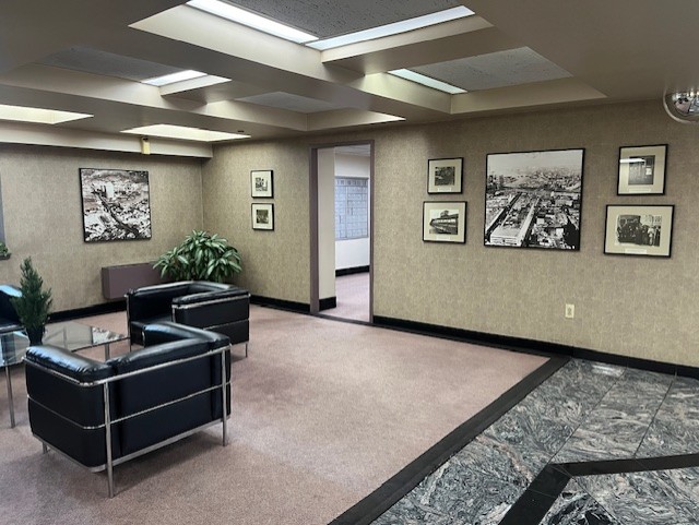 We mapped out where each group would go — considering wall sizes, sightlines, traffic patterns, and how people would naturally engage with the work in different parts of this expansive reception lobby, which features two large open seating areas, a central reception desk, and a long hallway stretching toward the elevators.
